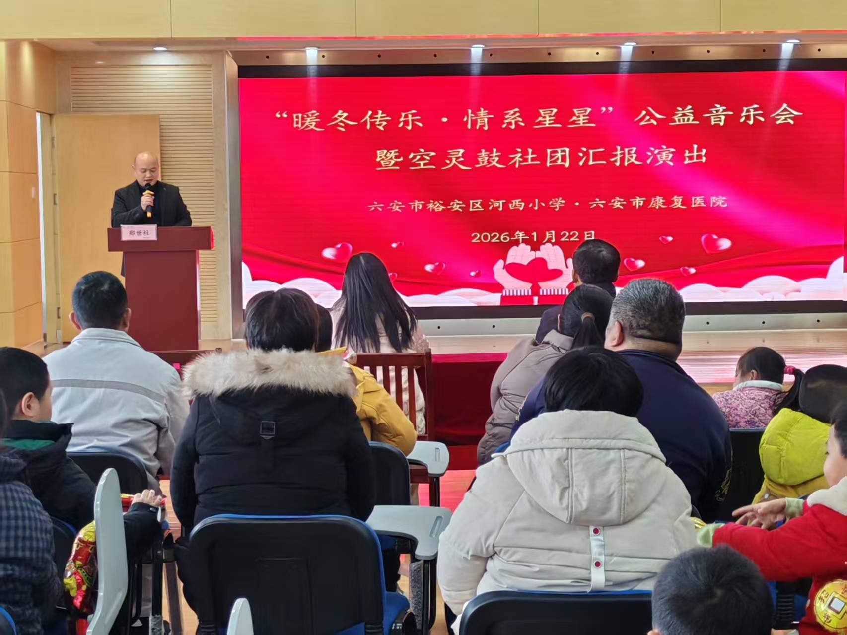 1月22日上午,六安市康复医院报告厅内乐声悠扬、暖意融融,我院携手河西小学,在此隆重举办“暖冬传乐·情系星星”公益音乐会。河西小学校领导、音乐教师,我院领导、康复师及爱心基地的孩子和家长齐聚一堂,共赴这场以乐为媒、传递大爱的公益之约,见证爱心共建基地的育人成果。
