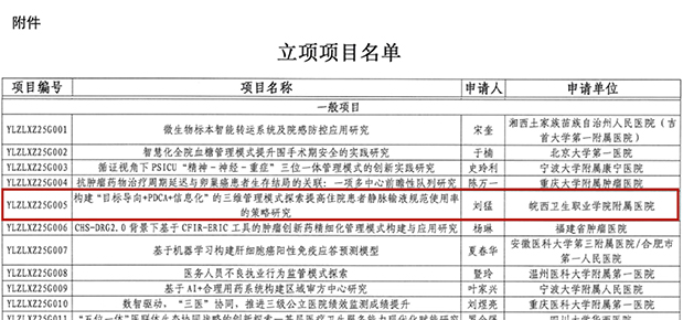 近日,国家卫健委医院管理研究所公布2025年医疗机构治理体系与能力现代化(循证)研究项目立项名单。皖西卫生职业学院附属医院(六安市第二人民医院)临床药学部主任刘猛申报的课题《构建“目标导向+PDCA+信息化”三维管理模式提升住院患者静脉输液规范使用率的策略研究(项目编号:YLZLXZ25G005)》成功获批一般项目立项。这是我院首次获得国家级科研项目。