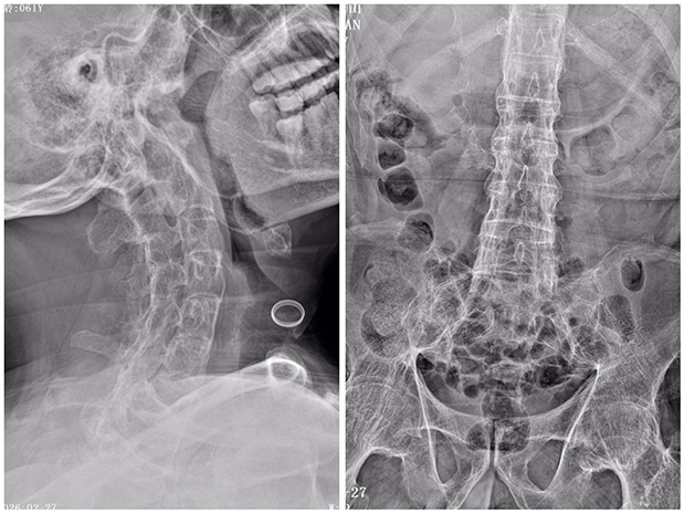颈、胸、腰椎及髋关节均已融合,膝关节无活动度。