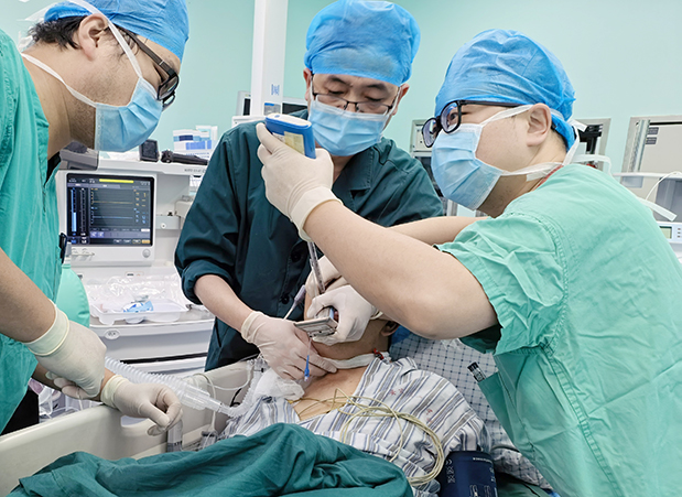 3月3日,经过充分术前准备,丁某被推进手术室,一场与死神博弈的“精准手术”正式启动。手术室里,无影灯亮如白昼,麻醉团队率先按预设方案实施个体化气道管理,凭借精湛技术顺利建立气道,实时监测血氧饱和度与血气变化,全程守护生命安全;手术室团队默契配合,精准调整手术体位,为手术开展筑牢基础。
