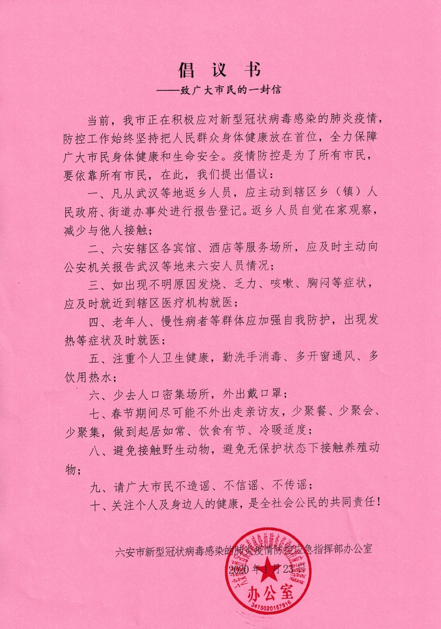 六安市新型冠状病毒感染的肺炎疫情防控指挥部办公室倡议书