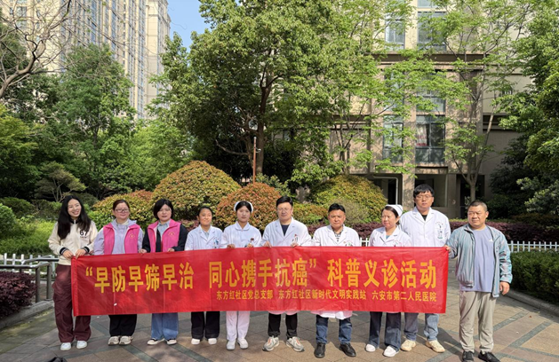 为深入学习贯彻落实习近平新时代中国特色社会主义思想和党的二十届四中全会精神,全面落实新时代党的建设总要求,推动党建工作与医院中心工作深度融合,充分发挥党支部战斗堡垒作用和党员先锋模范作用。4月17日,皖西卫生职业学院附属医院医疗管理支部、肿瘤内科支部联合东方红社区党总支部,在凯旋官邸小区开展全国肿瘤防治宣传周义诊活动。