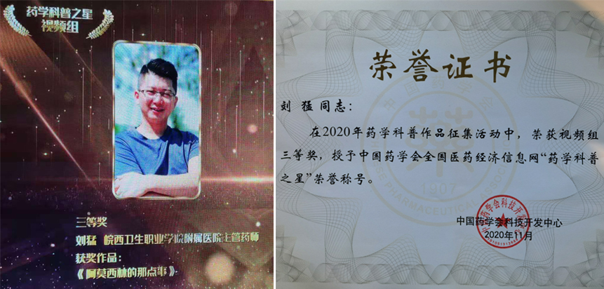 经全国医药经济信息网推荐,中国药学会全国医药经济信息网药学科普之星评审委员会评审通过,我院刘猛药师在2020年中国药学会药学科普作品征集活动中,荣获视频组三等奖,授予中国药学会全国医药经济信息网“药学科普之星”荣誉称号。