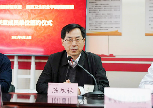 皖西卫生职业学院附属医院院长金平、安医大一附院高新院区副院长陈旭林分别代表双方签约