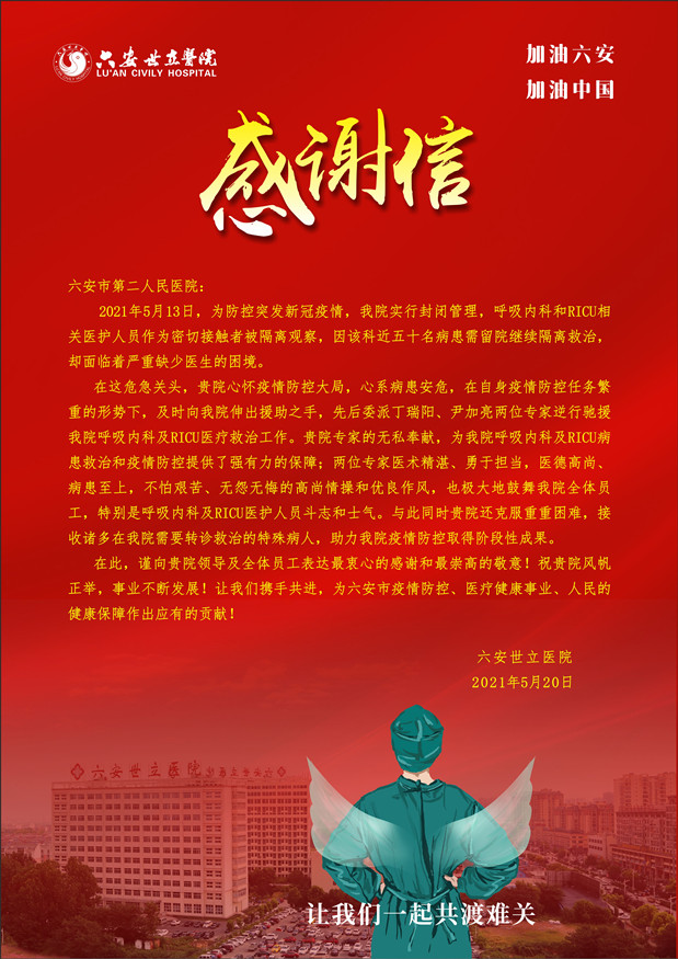 共抗疫情,感谢有你!一封来自六安世立医院的感谢信