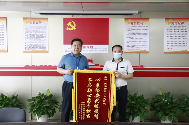 守初心,抗新冠,感恩情,送锦旗。6月11日上午,受裕安区委区政府委托,裕安区卫健委党组成员刘仁友一行将一面锦旗和一封感谢信送到皖西卫生职业学院附属医院,感谢我院为裕安区抗疫工作所作出的突出贡献。皖西卫生职业学院副院长、附院党委书记姜风会见并接受赠旗。