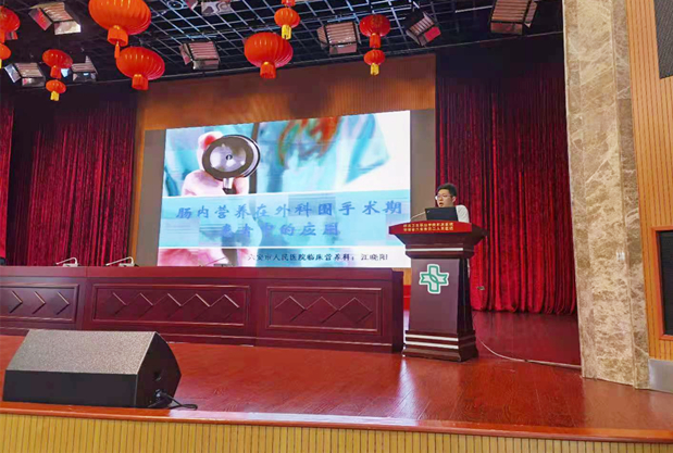 会议特邀六安市人民医院临床营养师江晓阳以《肠内营养在外科围手术期患者中的应用》为题,详细介绍了肠内营养定义、适应症、禁忌症等相关方面的知识,并结合工作实际开展特殊案例讲解。