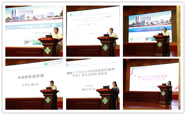 心内科主任何进舟、神经内科主任任长安、急诊科主任王峰分别汇报了2021年上半年胸痛中心、卒中中心和创伤中心的救治工作开展情况。医务部主任潘高勇、副主任王文敏、干事周子微分别对2021年上半年单病种质量管理、医疗纠纷投诉接待处理、主要工作指标进行了通报。