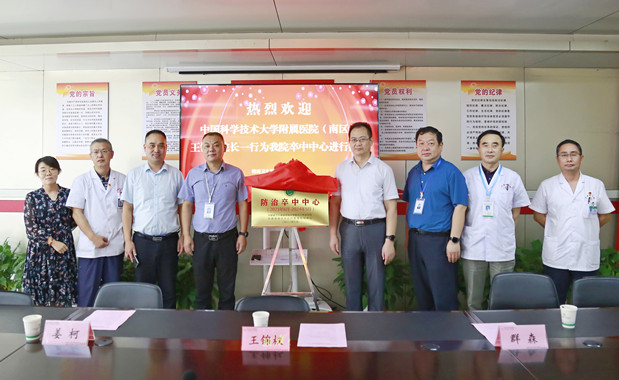 9月15日,皖西卫院附院(市二院)在行政楼三楼会议室举行“防治卒中中心”授牌仪式,中科大附属第一医院(安徽省立医院)南区副院长王锦权,神经内科主任群森,姜柯主任一行3人来院授牌,皖西卫生职业学院副院长、附院党委书记姜风,附院党委副书记、院长金平,副院长陈本鑫,院长助理郑华如,党委委员杨振时及相关科室人员参加仪式。授牌仪式由副院长陈本鑫主持。