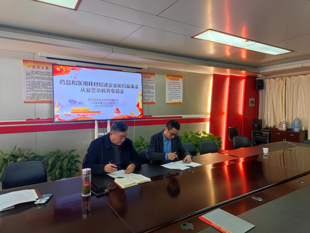 为落实《皖西卫生职业学院附属医院廉洁从业行动实施方案(2021-2024年)》,推进医院廉政建设,创建廉洁医院,营造清正廉洁的医药购销氛围,2021年12月23日上午,我院在行政楼三楼会议室召开了“药品和医用耗材配送企业履约及廉洁从业警示教育专题会”,院党委副书记杨兆应、纪委书记甄瑶、院长助理丁少成、纪检监察室主任解绍芹、物流管理部主任曾凡瑜以及近二十家医用耗材、药品配送企业代表参会,会议由杨兆应副书记主持。