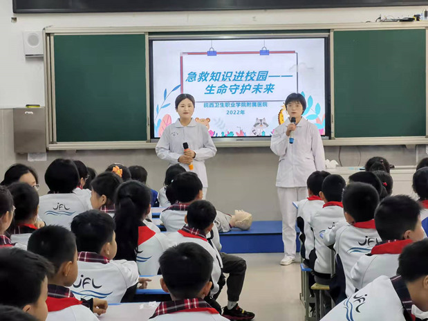 3月14日下午,我院夏玉婷和罗时伟两位老师走进解放路小学,为师生讲解急救相关知识,课程采取理论知识讲解和操作实践相结合的方式,主要包括气道异物急救、心肺复苏术等内容。课堂上,夏玉婷老师以通俗易懂的语言,详细讲解了急救相关知识,罗时伟老师对气道异物急救和心肺复苏术进行了现场演示,并鼓励学生亲手操练。同学们认真听讲,积极参与,通过学习,初步掌握了守护生命的急救技能,并感受到了学习急救知识的意义。