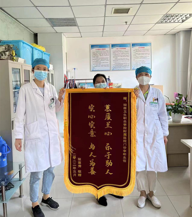 “非常感谢李主任在疫情期间,主动帮助我姐姐看病”,5月6日,患者张某的妹妹为门诊部李彬主任送来了一面致谢的锦旗。