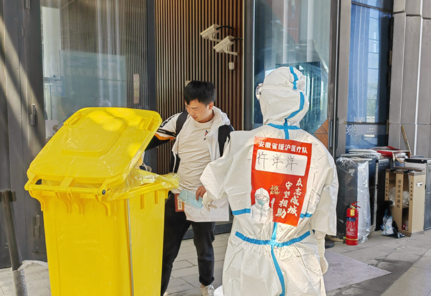 我院8名医疗队员中有5名是中国共产党员,是党员占比最高的队伍,隶属蚌埠医学院第一附属医院方舱院区临时第二党支部。入舱前,党员们重温入党誓词,在抗“疫”一线树立皖西红色革命老区勇当先锋、扎实苦干的精神,以实际行动践行共产党员的使命。为打好守“沪”战“疫”贡献自己一份力量,队员们根据工作部署,严格按照疫情防控标准,全方位无死角地进行医疗、护理和感控工作,他们恪守各班次职责,牢记工作流程,无论是物资班、外围班、责任班、感控班,还是采样突击班,均可胜任。