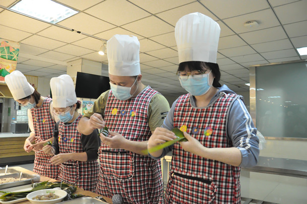 “把粽叶折成一个漏斗的形状,填完米,将粽叶折过来,捋成三角形形成一个盖子。”“粽叶要这么卷才不漏米,绳子这样扎才紧实”,部分有经验的职工主动当起了“师父”,新手们虚心求教,也有模有样地包了起来,渐渐地掌握了包粽子技巧,三角形、菱角形等形态各异的粽子迅速成型,不一会儿,大家都包出了馅料丰富、造型美观的粽子,每个人脸上都洋溢着欢乐的笑容,并带着胜利的果实愉悦而归。