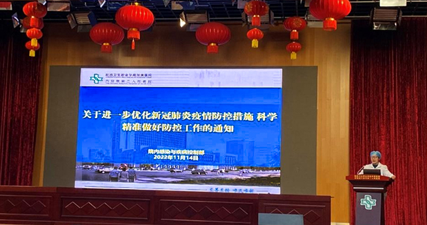 院内感染和疾病控制部主任方萍解读了《关于进一步优化新冠肺炎疫情防控措施、科学精准做好防控工作的通知》,通报了第三季度医院感染管理质量指标并分析改进措施。