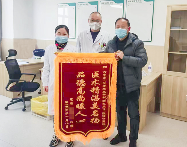 2023年1月9日下午,患者家属送来一面锦旗,上面写着“医术精湛美名扬 品德高尚暖人心”。表达了对老年医学科主任薛礼、主治医生张倩倩治疗效果的认可和感激之情。