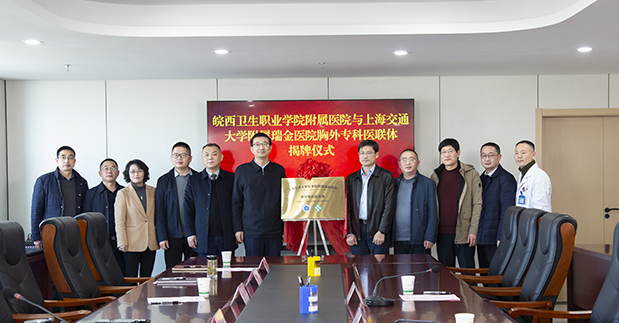 从长江之滨到淠河之畔,“健康六安”奏响新时代乐章。2月26日下午,上海交通大学医学院附属瑞金医院与皖西卫生职业学院附属医院(市二院)胸外专科医联体揭牌仪式在我院第二会议室隆重举行。上海瑞金医院胸外科主任李鹤成,皖西卫生职业学院党委书记汪斌,六安市卫健委党组成员、副主任程立,我院党委书记金平、院长赵本泉等领导班子及相关科室负责人出席揭牌仪式。