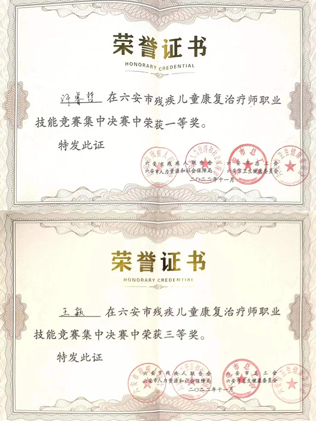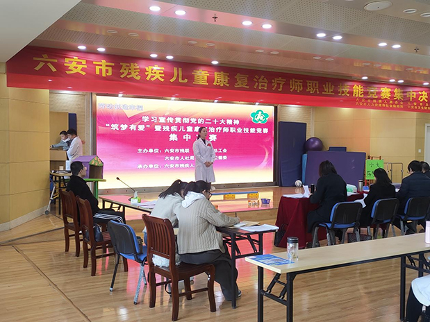 为了提升我市残疾儿童康复治疗师的专业技术水平,提高残疾儿童康复服务质量和效果。3月2日由六安市残联、六安市总工会、六安市人社局、六安市卫健委主办的“六安市残疾儿童康复治疗师职业技能竞赛集中决赛”在六安市残疾康复中心八楼多功能厅成功举办。我院代表队喜获佳绩。