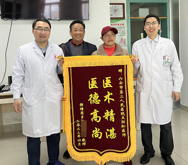 4月5日上午,患者何女士在家人的陪同下将一面印有“医术精堪、医德高尚”的锦旗送到了重症医学科(ICU)王劲松医师手中,感谢住院期间全体医护人员对自己的全力救治和精心护理。