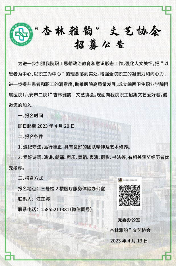 为进一步加强我院职工思想政治教育和意识形态工作,强化人文关怀,把“以患者为中心、以职工为中心”的理念落到实处,增强全院职工的凝聚力和向心力,进一步提升患者和职工的满意度,经医院党委研究同意,皖西卫生职业学院附属医院(六安市二院)“杏林雅韵”文艺协会于2023年4月13日正式成立。