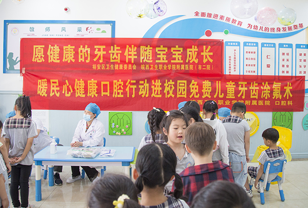 为贯彻安徽省十项暖民心工程健康口腔行动,响应裕安区“暖民心健康口腔行动”进校园项目,降低儿童乳牙龋齿病的发生率,改善儿童口腔健康状况,2023年5月15日,皖西卫生职业学院附属医院(市二院)口腔科医护人员走进振兴共和城幼儿园,开展儿童牙齿免费涂氟活动。