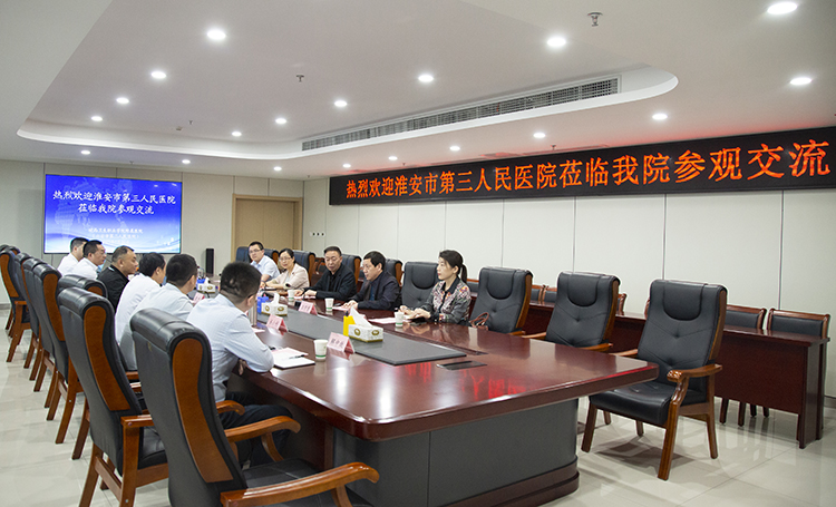 2023年5月24日,淮安市第三人民医院党委书记范智勇一行5人来院考察交流,皖西卫生职业学院党委委员、副院长、附院党委书记金平,党委委员、副院长涂有运及有关科室人员参加座谈交流。会议由院长助理、市精神卫生中心主任童庆好主持。