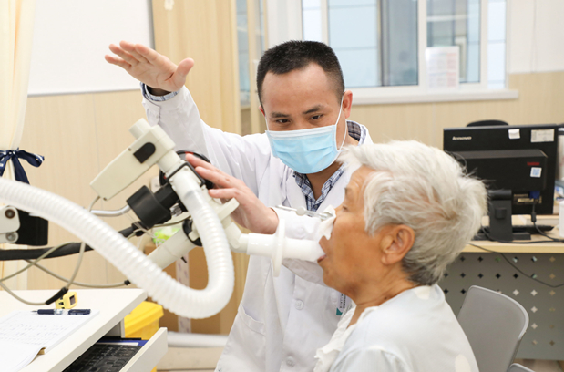 呼吸与危重症医学科医师夏志庭正在为患者进行肺功能检查