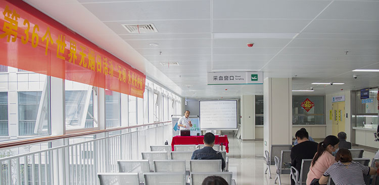 呼吸与危重症医学科副主任石峻在门诊内科楼检验科采血大厅开展戒烟控烟宣教课堂,通过PPT讲解、动画播放等方式介绍香烟成分、吸烟对人体的危害、因吸烟易引起的常见疾病和戒除烟瘾的方法等,倡导就诊人员摒弃吸烟陋习,远离传统烟草产品和电子烟,培养健康生活方式,做好戒烟控烟宣传,营造无烟、清洁环境。