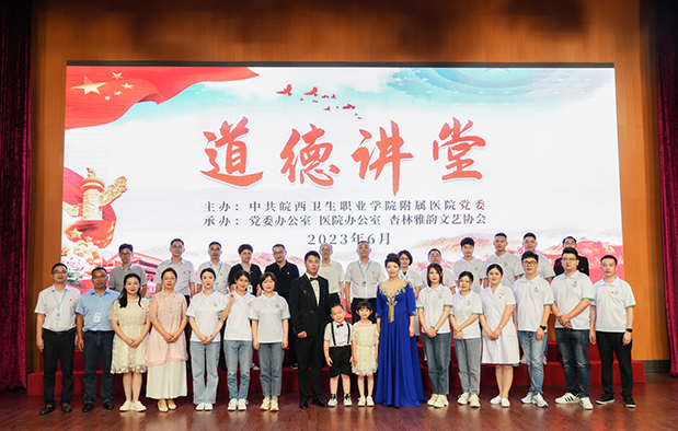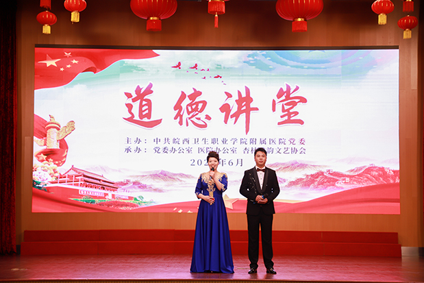 此次道德讲堂由党办、院办和院杏林雅韵文艺协会承办,活动首先观看了安徽省“五一劳动奖章”获得者——急诊科王峰主任坚守一线岗位的先进事迹视频,真实展现了我院医护工作者献身卫生事业、争创一流业绩的白衣天使风采。活动中,为展现我院最美“医”瞬间,讲述二院故事,院杏林雅韵文艺协会经过一个多月的征集制作,通过视频摄影展形式,叙述了医院历史、疫情防控、崭新开局、优质服务和职工风采,体现了全院职工奉献、爱院的主人公情怀。来自医院各个系统、部门的协会成员和职工子女倾情演绎了歌曲《让爱住我家》,古筝演奏《渔舟唱晚》,歌曲《中国人》、《我们都是追梦人》,充分显示出我院职工的爱国爱家之情及医院奋进、逐梦前行的青春风貌。