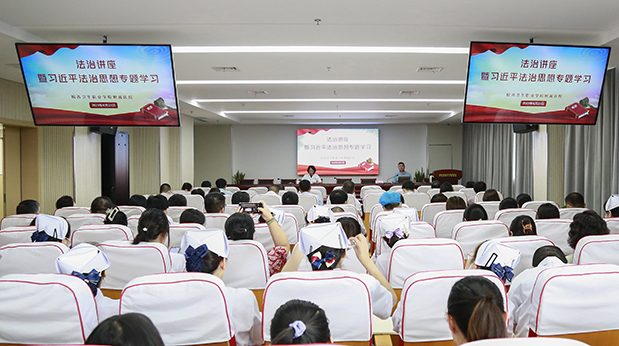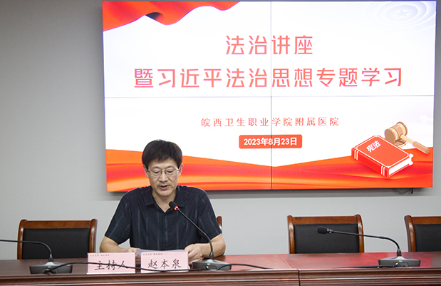 按省卫健委《三级公立医院法治建设评估工作方案》和市法宣办《关于开展2023年“机关法律学习月”活动的通知》有关要求和工作部署,8月23日下午,我院特邀六安市司法局党组成员、副局长张良平莅临授课,开展法治讲座暨习近平法治思想专题学习。党委副书记、院长赵本泉等院领导班子出席会议,行政职能科室工作人员、临床医技科室主任、护士长参加学习。