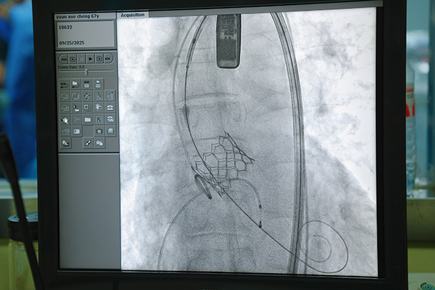 9月25日,手术团队为袁先生实施了TAVR手术。手术采用经股动脉入路,首先在患者右侧股动脉处进行穿刺,建立血管通路,随后沿导丝置入输送鞘管。将压缩状态的人工生物瓣膜装载于专用输送导管上,在数字减影血管造影(DSA)影像引导下,将输送导管精准送至主动脉瓣环水平。通过食管超声及DSA双重定位确认瓣膜位置无误后,强制高频起搏心脏、释放人工瓣膜,使其与自身主动脉瓣环紧密贴合,实现瓣膜功能重建。整个手术过程操作精准,时间短,术中生命体征平稳,有效规避了传统手术的高风险因素。