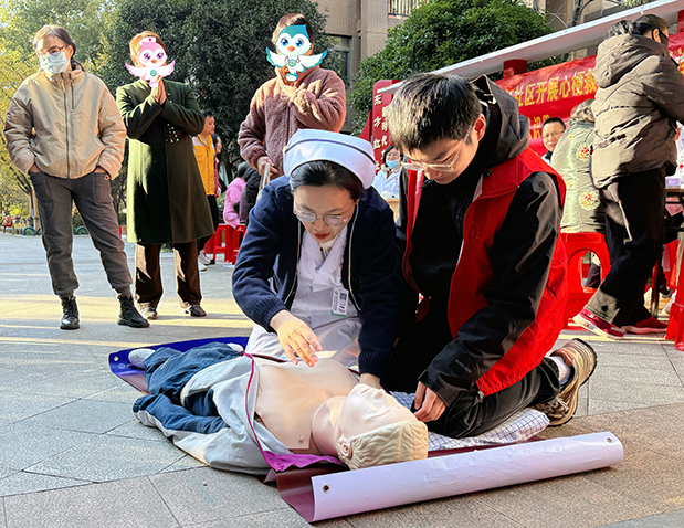 在心肺复苏模拟演练环节,护士团队用模拟人演示并教学胸外按压、人工呼吸等操作,居民踊跃实践,医护人员现场纠正动作,助力大家掌握急救技能。