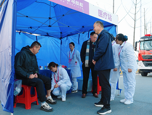 11月30日,2025六安马拉松在晨曦中激情开跑。皖西卫生职业学院附属医院(六安市第二人民医院)党委书记程志平带队,以“护航马拉松,党员在行动”开展主题党日活动,深入赛事一线,查看了医院司法鉴定所直属党支部在赛区设置的公益展台,并亲切慰问医院医疗保障人员。