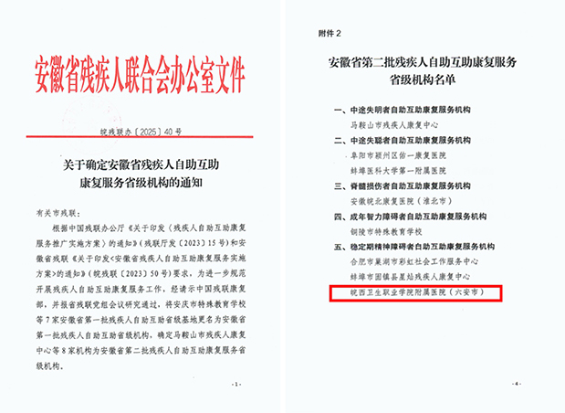 近日,皖西卫生职业学院附属医院(六安市第二人民医院)获评“省级精神障碍患者自助互助康复服务基地”。该荣誉是对医院在精神康复领域专业能力、服务模式创新及社会贡献的充分肯定,标志着我院在推动精神障碍社区康复、构建患者支持体系方面取得重要进展。