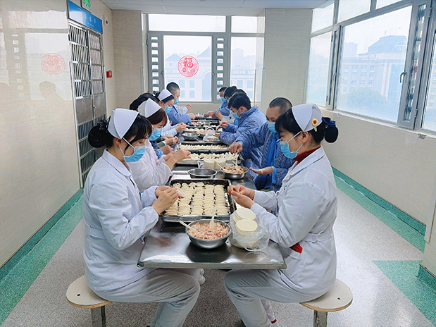 与急诊医学科的“争分夺秒”、手术室的“生死较量”不同,市二院精神科里处处涌动着暖流。2月17日上午,精神科活动室内,一场热闹温馨的包饺子比赛正在火热开展。该科二病区主任赵哲婷、护士长潘显柱与几十名患者围坐在一起,和面、擀皮、包馅,分工协作,欢声笑语不断,大家亲手包起一个个象征着新春祝福的饺子,让暖意漫满整个屋子。